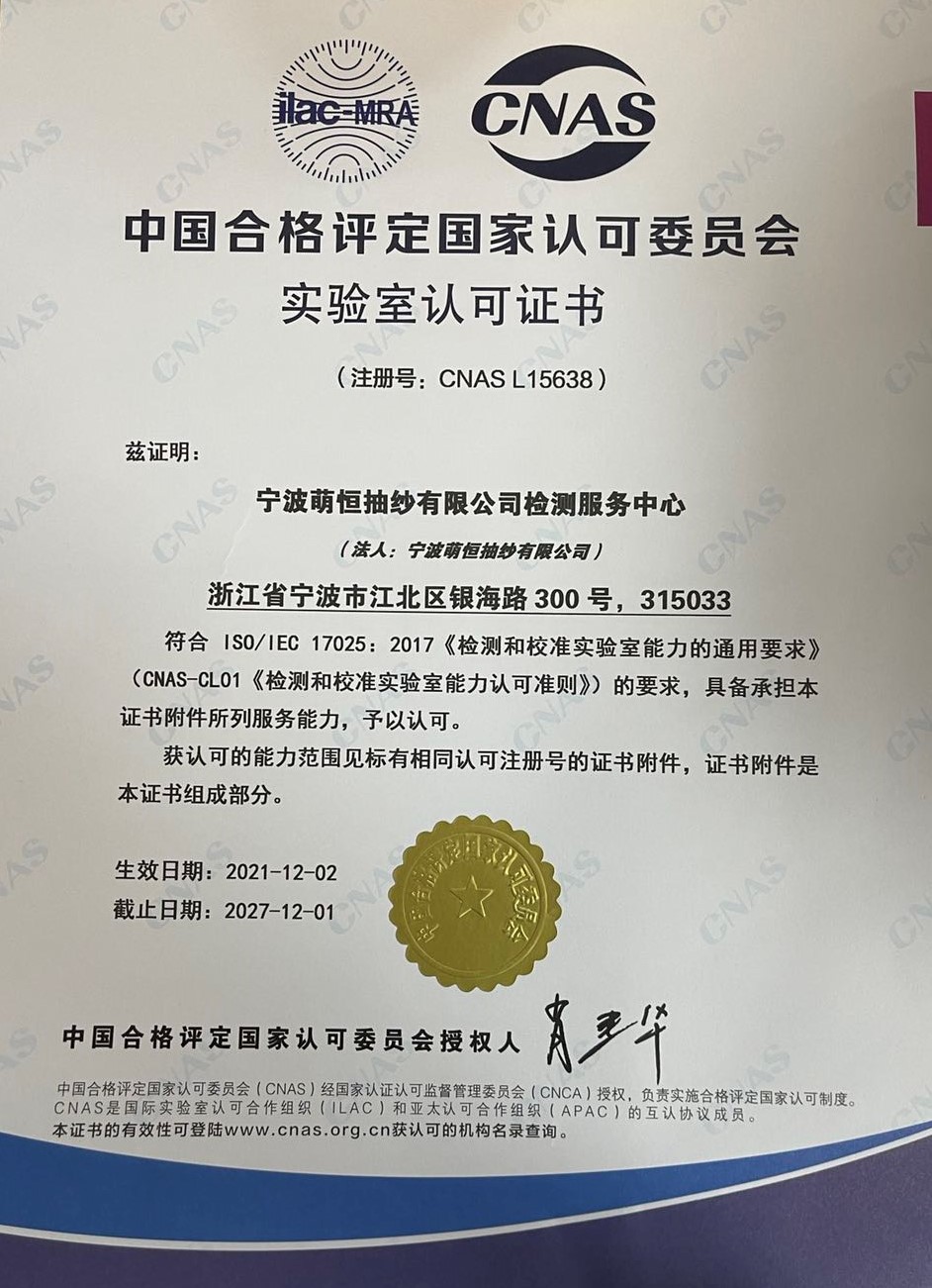 近日,寧波萌恒抽紗有限公司檢測服務中心正式獲得中國合格評定國家認可委員會(CNAS)資質認可。 CNAS認證是針對檢測室進行的極其復雜但又極具權威的認證,由國家認證認可監督管理委員會批準設立并授權的國家認可機構,統一負責對認證機構、實驗室和檢查機構等相關機構的認可工作,主要分為文件審核和現場審核兩個部分,前階段,萌恒抽紗有限公司檢測服務中心已通過文件審核、現場審核與整改,于近日正式獲得CNAS資質認可。 通過認證后,公司的檢測水平和產品質量控制將會有很大的提升,其意義在于:1、表明具備了按相應認可準則開展檢測和校準服務的技術能力;2、增強市場競爭能力,贏得政府部門、社會各界的信任;3、獲得簽署互認協議方國家和地區認可機構的承認;4、有機會參與國際間合格評定機構認可雙邊、多邊合作交流;5、可在認可的范圍內使用CNAS國家實驗室認可標志和ILAC國際互認聯合標志;6、列入獲準認可機構名錄,提高知名度。