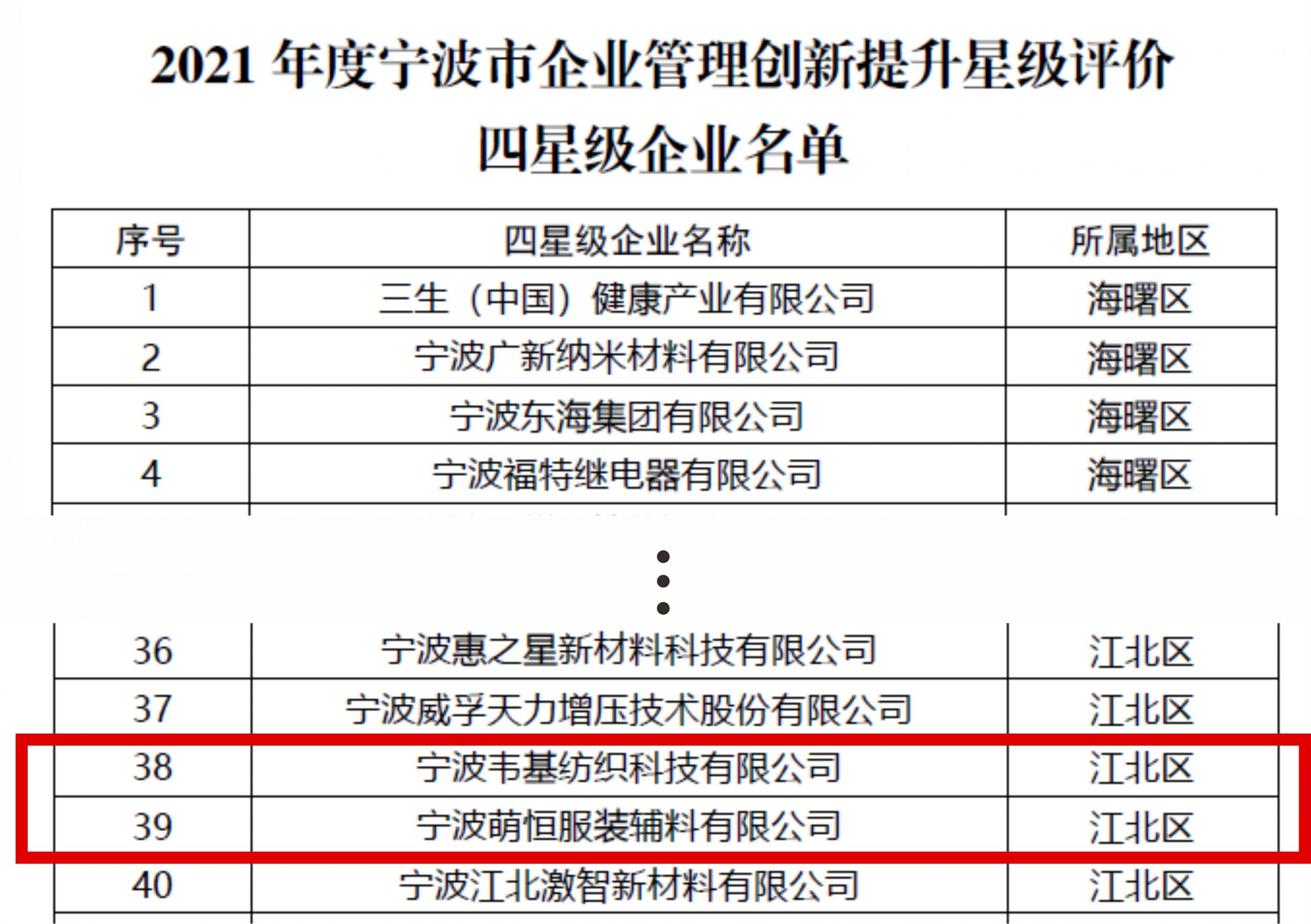 韋基紡織科技有限公司、萌恒服裝輔料有限公司獲批寧波市企業(yè)管理創(chuàng)新四星級(jí)企業(yè)