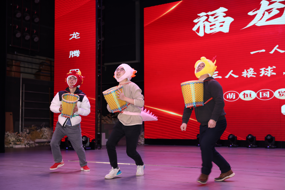 游戲互動環(huán)節(jié),大家都踴躍參與。一人勝出,全桌獲獎的游戲規(guī)則,將大家的凝聚力和團結心體現(xiàn)得淋漓盡致。猜歌名,唱歌曲,你不會,我來唱!大家一起齊心協(xié)力,集思廣益。在福龍戲珠環(huán)節(jié),三個可愛龍龍的T臺秀引來陣陣歡笑,福龍奮力接取萌兔拋出的珍珠的樣子更是抓住了所有人的眼球。這也寓意著龍年接過兔年的交接棒,相信我們在新的一年會更加充滿激情和活力,奮勇爭先,拔得頭籌!