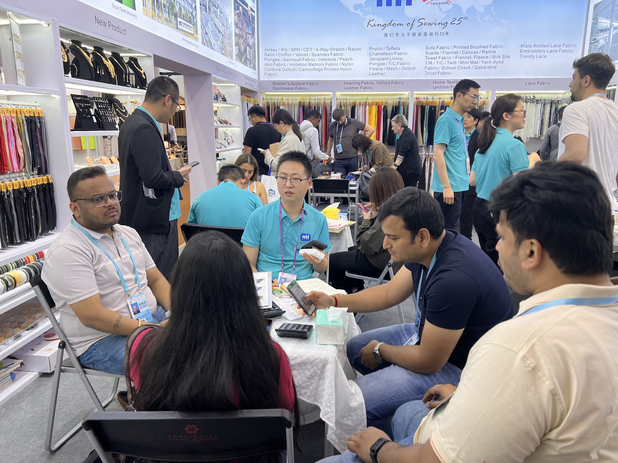 展會期間,我們共接待了世界各國的客商945名,客戶群體更豐富,客戶數明顯高于上屆廣交會。產品方面,二期家居攤位的展示盒類、環保產品,禮品攤位的特殊帶類獲得了客戶的青睞;三期紡織面輔料攤位琳瑯滿目的面輔料全品類吸引了新老客戶眼球,客戶絡繹不絕,人聲鼎沸。業務員耐心引導,并為客戶講解各類產品。他們專業的素養和熱情的服務,讓客戶感受到了用心,也贏得了客戶信任和好評。