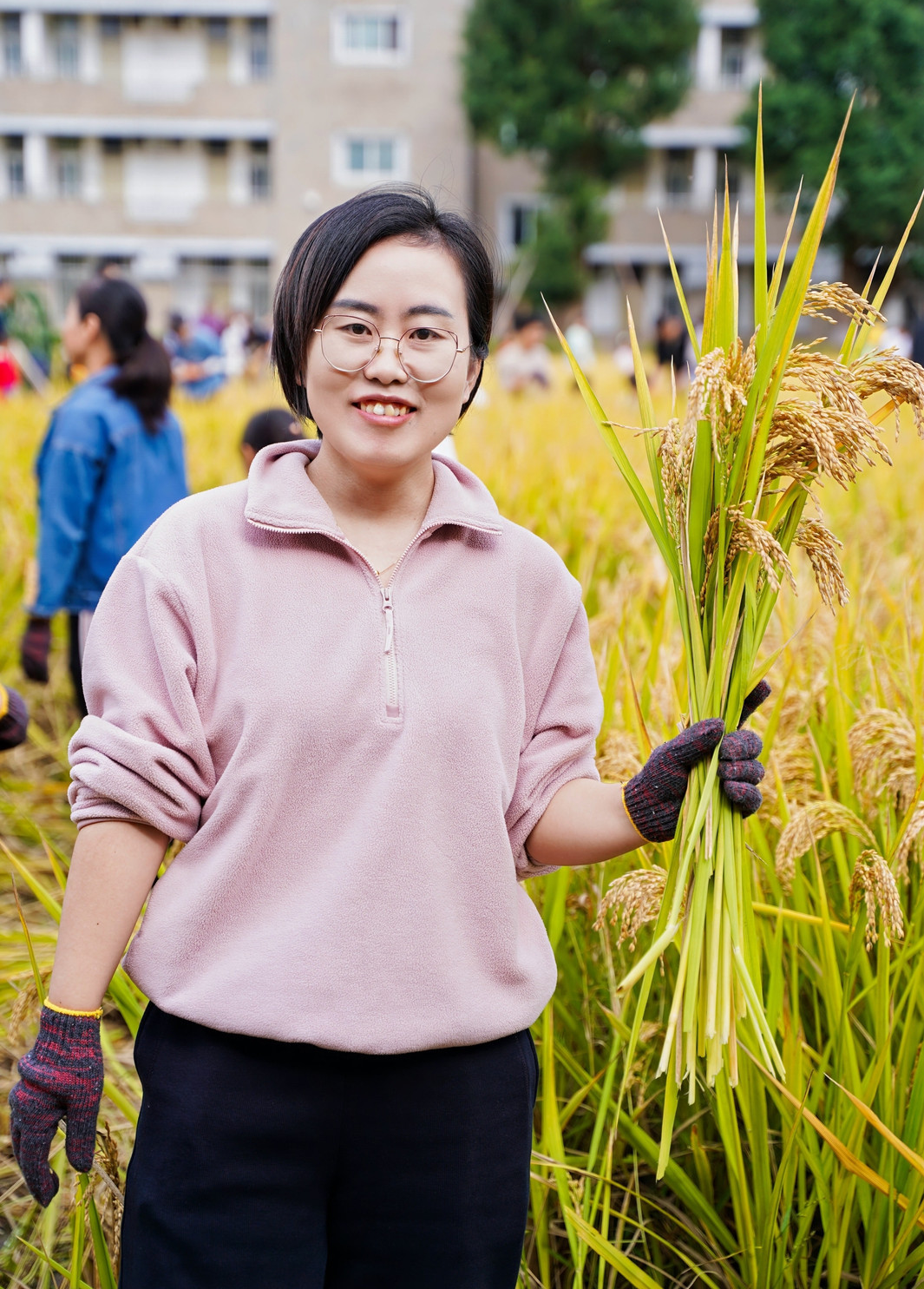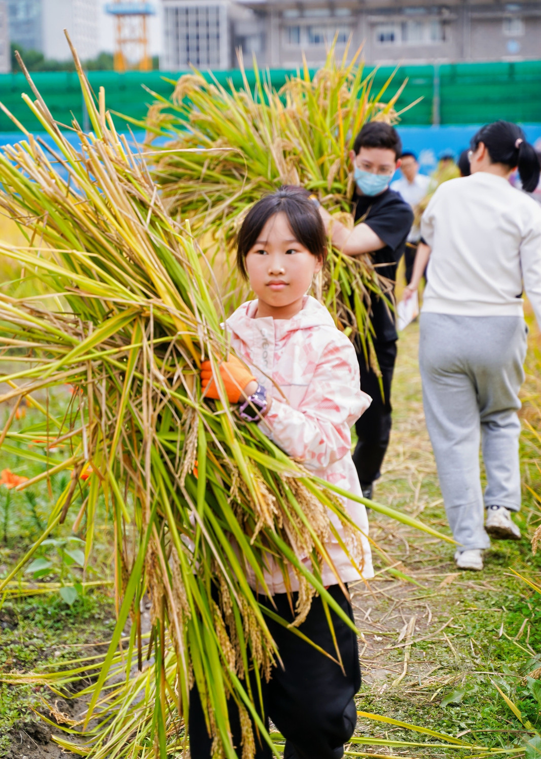 最后登場(chǎng)的是激動(dòng)人心的水稻收割環(huán)節(jié),家長(zhǎng)與孩子們攜手踏入金黃的水稻田,瞬間化身為勤勞的農(nóng)夫。稻田里,有的家庭分工明確,家長(zhǎng)負(fù)責(zé)收割,孩子們則負(fù)責(zé)搬運(yùn),配合默契十足;有的家庭則全家齊上陣,共同體驗(yàn)收割的樂(lè)趣。孩子們初次體驗(yàn)水稻收割,臉上洋溢著好奇與興奮的笑容,盡管動(dòng)作略顯生疏,但那份認(rèn)真的態(tài)度讓人動(dòng)容。收割完成后,大家又一同進(jìn)行脫穗、裝袋、稱(chēng)重,每一個(gè)步驟都充滿了歡聲笑語(yǔ),整個(gè)稻田都沉浸在一片歡樂(lè)的海洋之中。