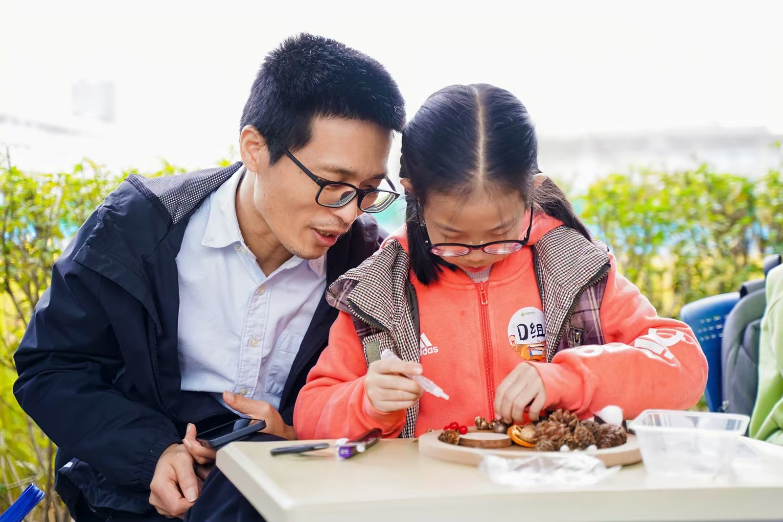 緊接著在“秋的定格”環(huán)節(jié)里,孩子們充分發(fā)揮自己的想象力與創(chuàng)造力,以干花、水稻等充滿秋日氣息的植物為素材,精心創(chuàng)作屬于自己的獨(dú)特藝術(shù)品。他們?nèi)缤⌒〉乃囆g(shù)家,將對(duì)秋天的熱愛(ài)與感悟融入到每一個(gè)作品細(xì)節(jié)之中,或粘貼,或拼接,忙得不亦樂(lè)乎。不一會(huì)兒,一件件別具匠心的秋日藝術(shù)品便呈現(xiàn)在大家眼前,每一件都飽含著孩子們對(duì)大自然的贊美與秋收的喜悅。而暖意也在親子共同創(chuàng)作作品的過(guò)程中不斷涌動(dòng)。