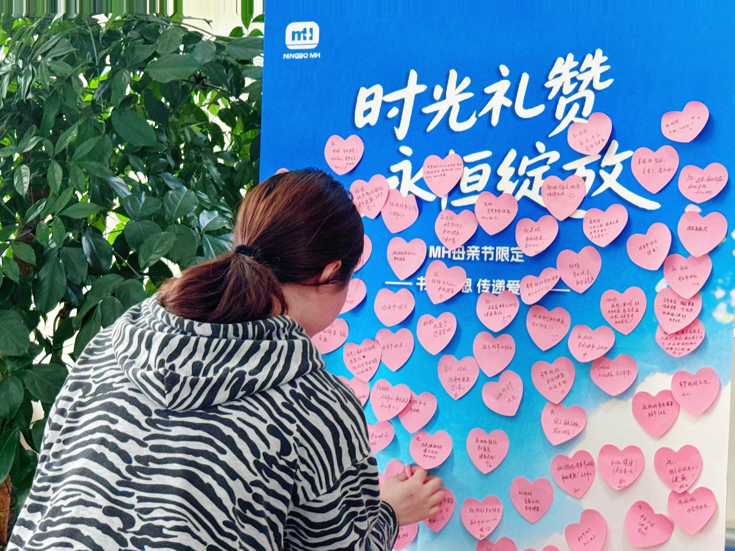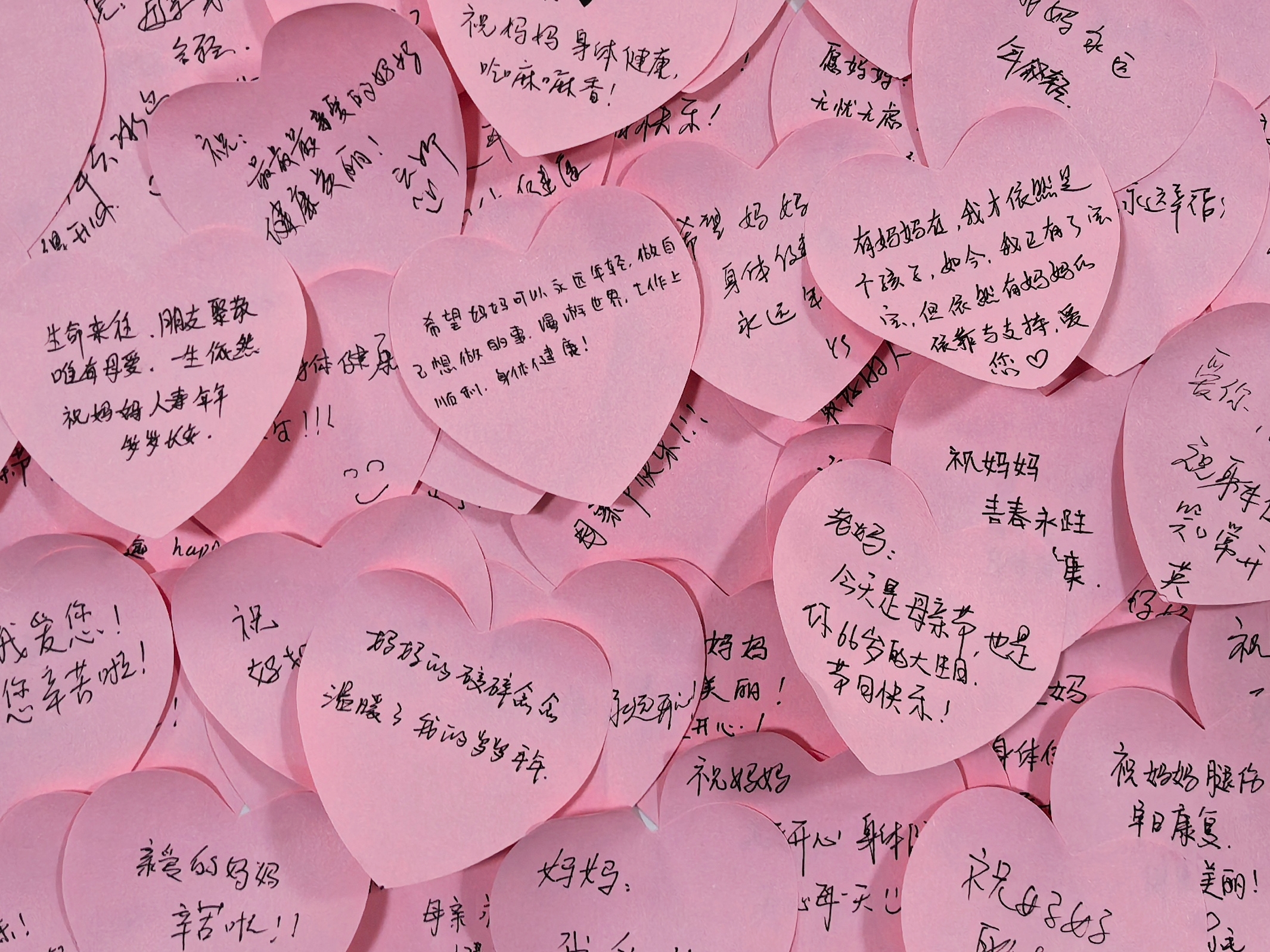 一樓大廳同樣熱鬧非凡,小伙伴們在愛心便利貼上紛紛寫下對媽媽的祝福,并張貼在留言板上。那些真摯的文字,定格了我們對媽媽的溫情告白。還有小伙伴感言道:”好巧,今天剛好是我媽媽的生日,這也太有儀式感了?!闭f完就拿出手機拍下祝福,將這份心意實時傳遞給媽媽。