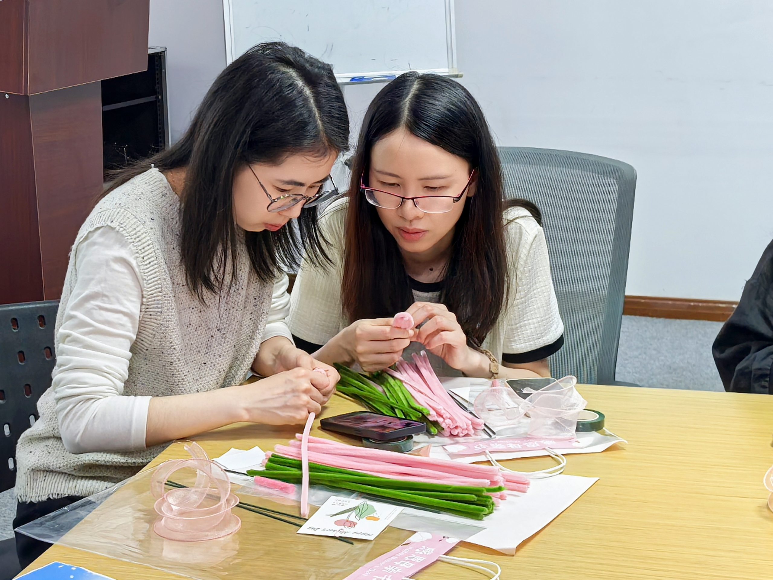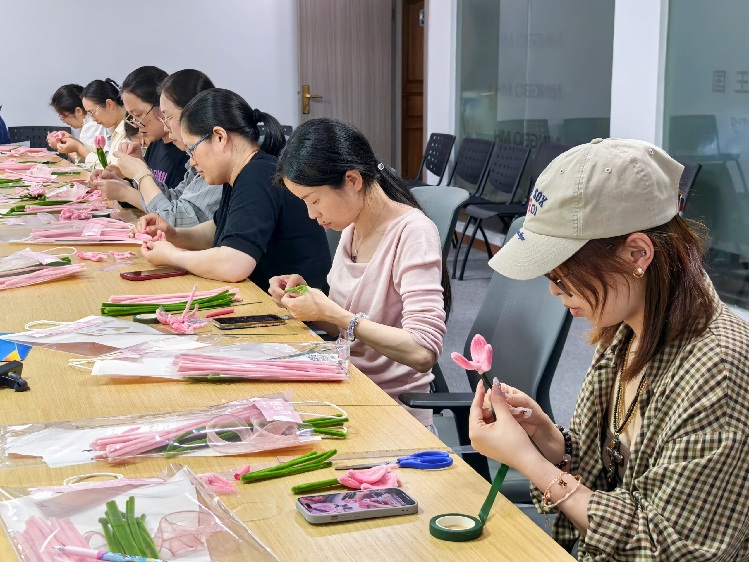 經過一個小時的努力,一朵朵粉嫩的郁金香在指尖逐漸綻放。耐心制作、細心包扎,精美的花束承載著我們對母親的深情。那一刻,我們不僅是職場人,更是一群想要把愛意傳遞給母親的孩子?;蛟S我們不善言辭,但指尖的溫度會替我們訴說——那些藏在心底的感謝,那些未能常伴左右的歉意,還有那份永遠不變的牽掛。