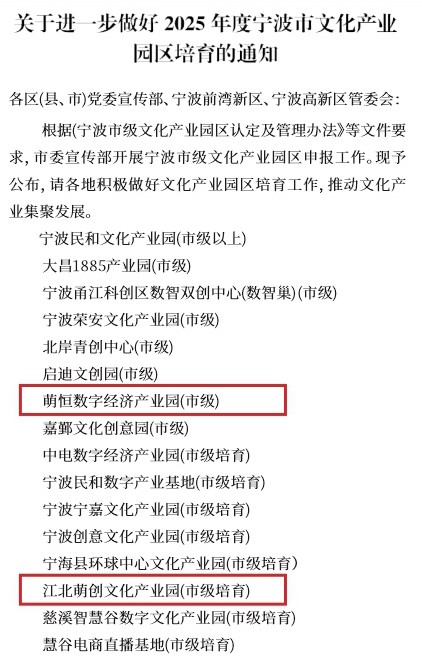 近日,中共寧波市委宣傳部正式公布2025年度市級文化產業園區認定名單,萌恒數字經濟產業園與江北萌創文化產業園雙雙入選,分別獲評“市級園區”和“市級培育園區”稱號。 近年來,寧波市大力推動文化產業發展,出臺多項政策助力產業升級。今年4月,為推動文化產業集聚發展,培育新型業態,激發創新活力,打造增長新引擎,寧波市文化產業園區申報工作正式啟動,入選園區需在產業集聚、運營管理、社會效益等方面達到嚴格標準。兩個園區對標創建標準積極開展各項申報工作,并在激烈競爭中憑借綜合實力勝出,獲此殊榮。 此次獲獎,不僅是對兩個園區過往努力的高度認可,更是為未來發展注入了強大動力。相信在公司的引領下,在相關政策的扶持下,萌恒數字經濟產業園與江北萌創文化產業園將繼續砥礪前行,不斷開創產業發展新局面,為公司的持續繁榮貢獻更大力量。
