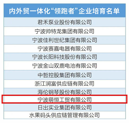 據悉,浙江省培育內外貿一體化“領跑者”企業,旨在加快建設國內國際雙循環戰略支點和樞紐,充分發揮示范企業在促進內外貿穩中提質方面的示范帶動作用,從銷售情況、品牌建設、質量標準、營銷建設和商業模式等方面對企業進行綜合評價。入選名單的企業將獲得政府一定的政策扶持,以鼓勵先行先試。萌恒獲此殊榮,既是業界對萌恒的高度認可,也是對我們推動行業發展所做努力的肯定。