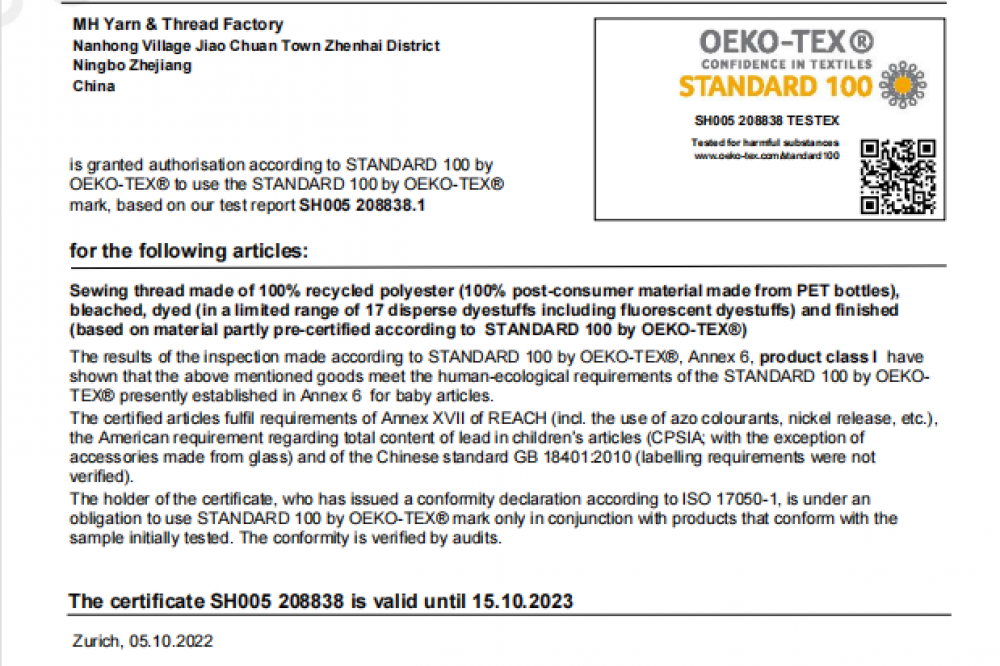 近日,萌恒線業生產的再生滌綸縫紉線順利通過生態紡…